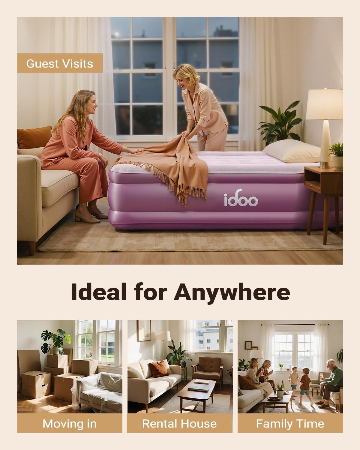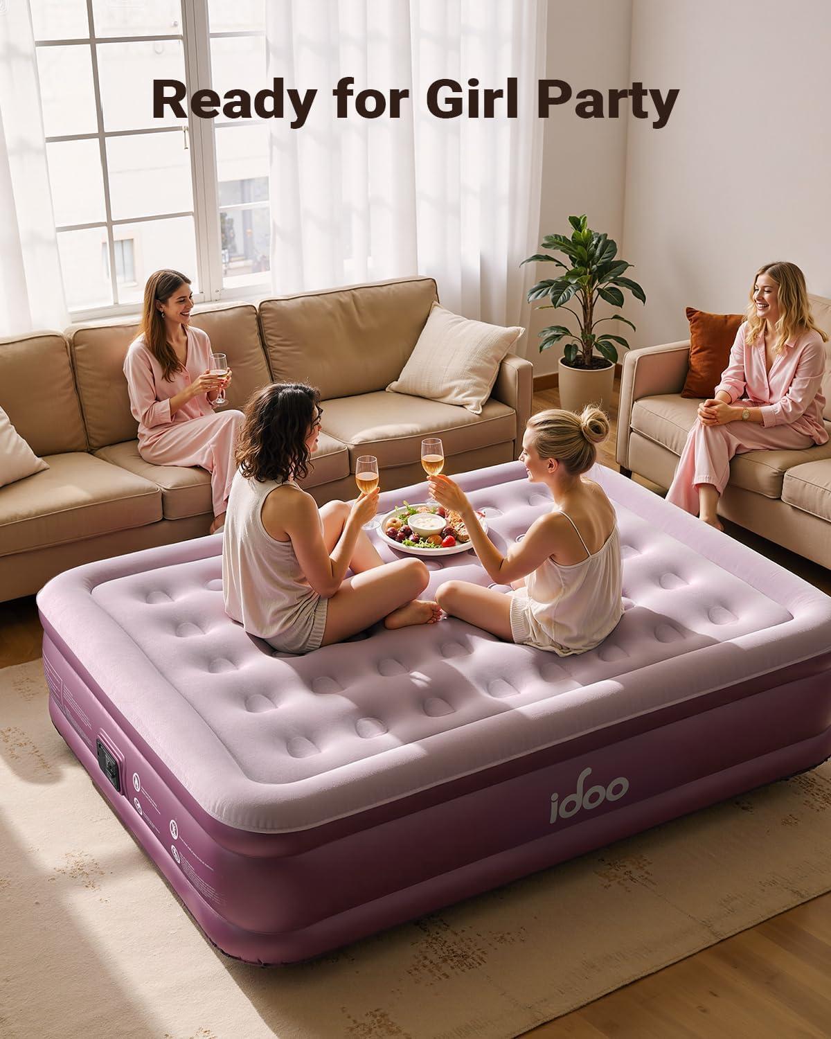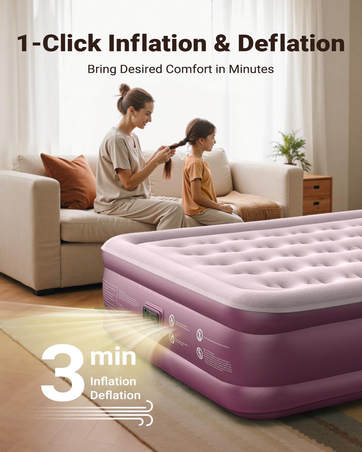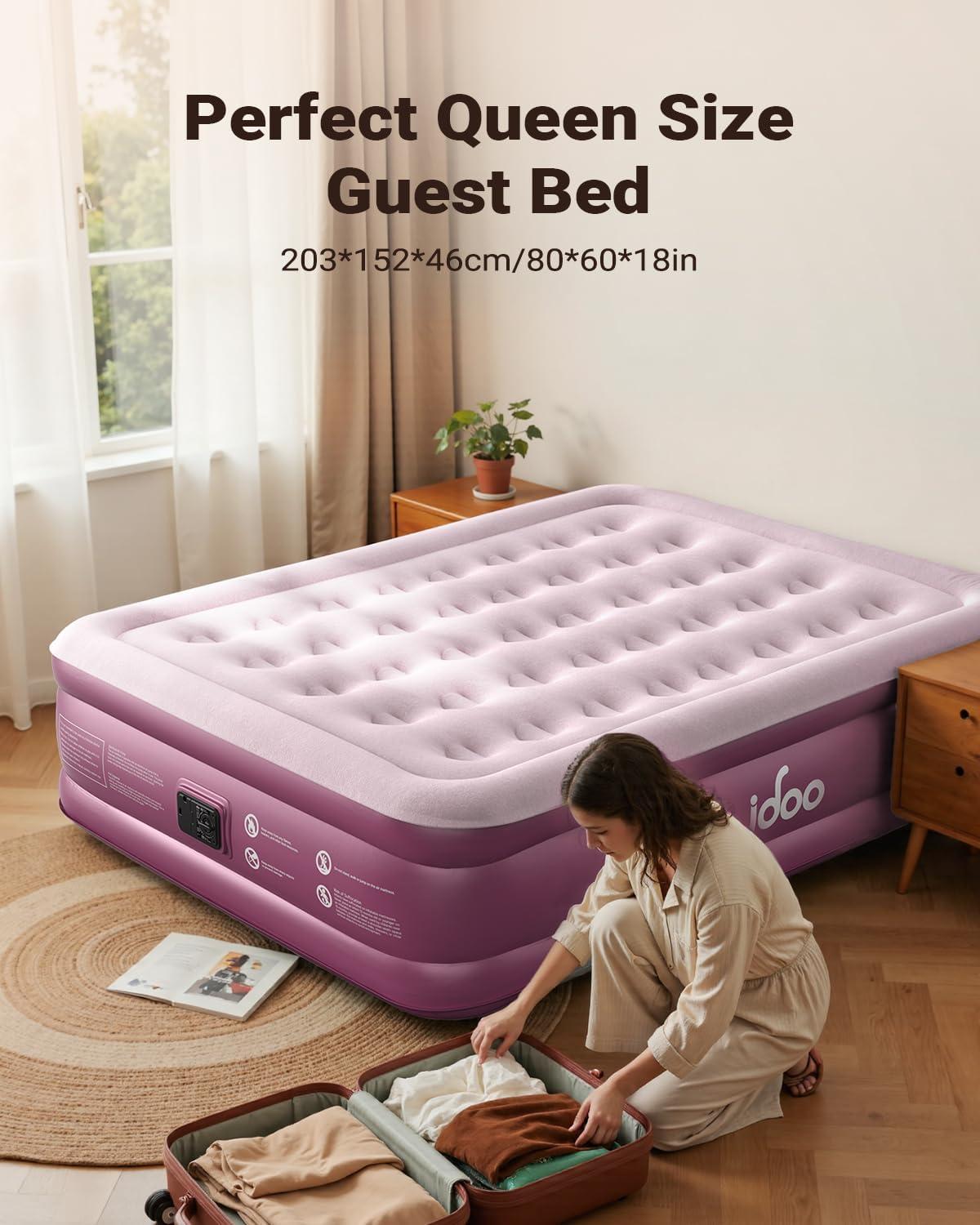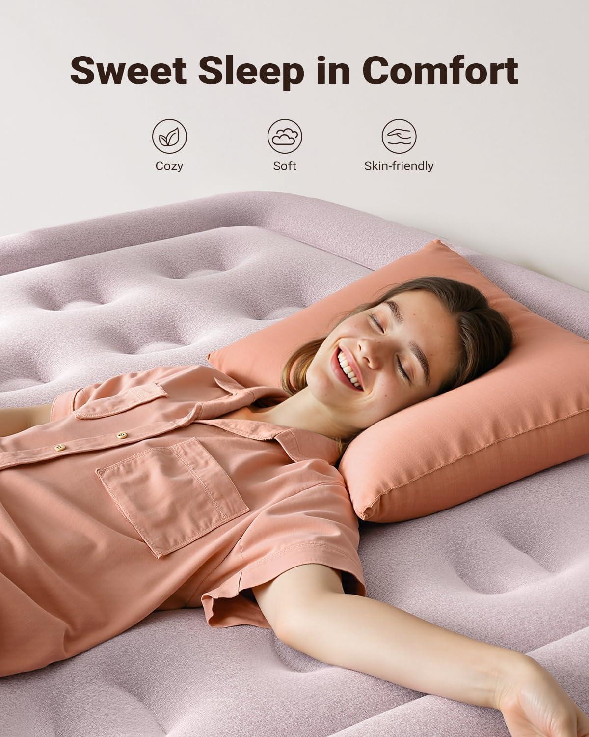 Calm and Comfort: Our queen air mattress is crafted with a pink soft and breathable flocked surface, which helps us reduce stress and anxiety, creates a peaceful and relaxing environment that brings inner peace and warmth