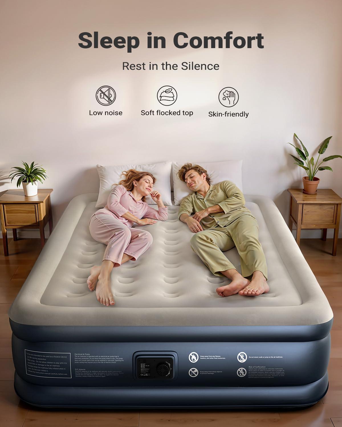 Fast Inflation/Deflation: Are you still troubled by manually inflating? Our inflatable mattress queen, equipped with a built-in electric pump, would be inflated/deflated within 3 minutes, fast and easy