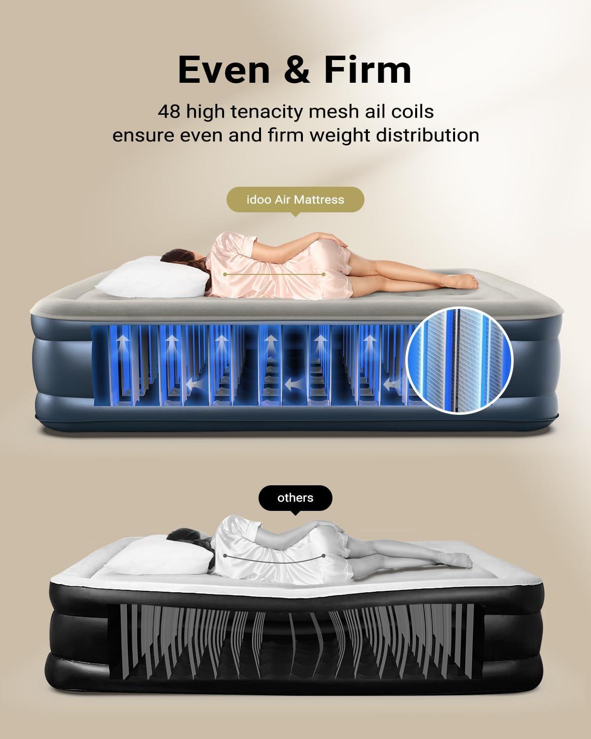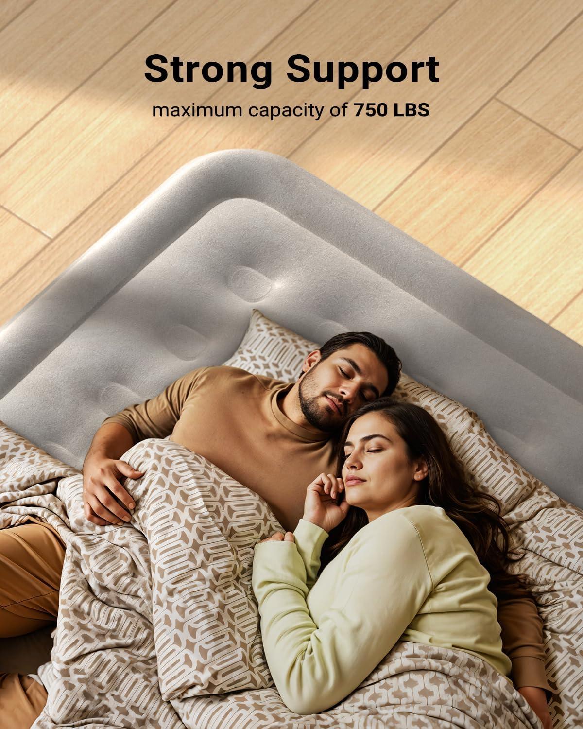 Stay Firm All Night – The king size air mattress, equipped with exclusive and Innovative four chamber structure, boats 48 air coils with a maximum load capacity of 750 lbs, delivering extremely support and comfort throughout the night