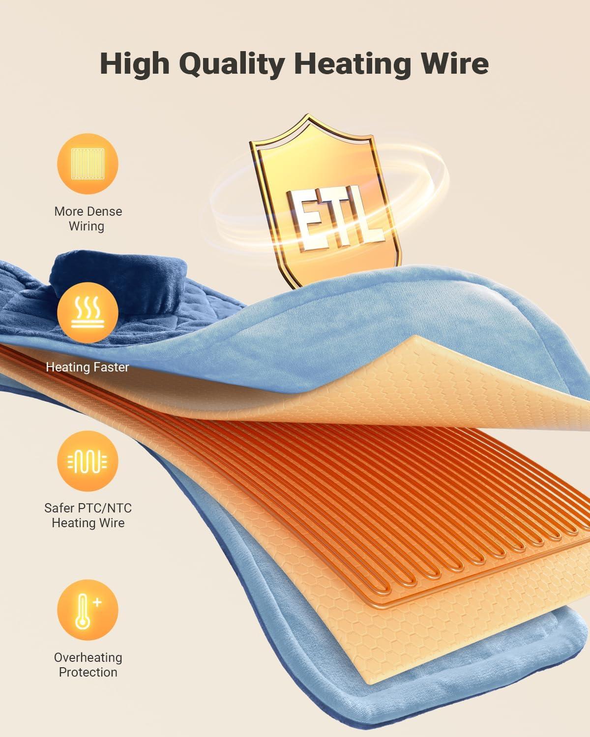 Safe & Energy Efficient: This ETL-certified heating pads with the upgraded PTC/NTC heating wire design with overheat protection, high temperature protection, It can prevent overheating and scalding your skin, built-in dense heating wire ensures that the electric heating pad heats up quickly and evenly.