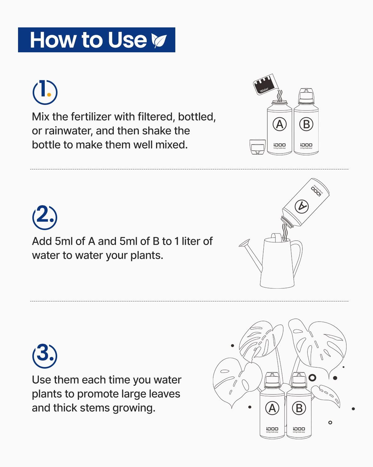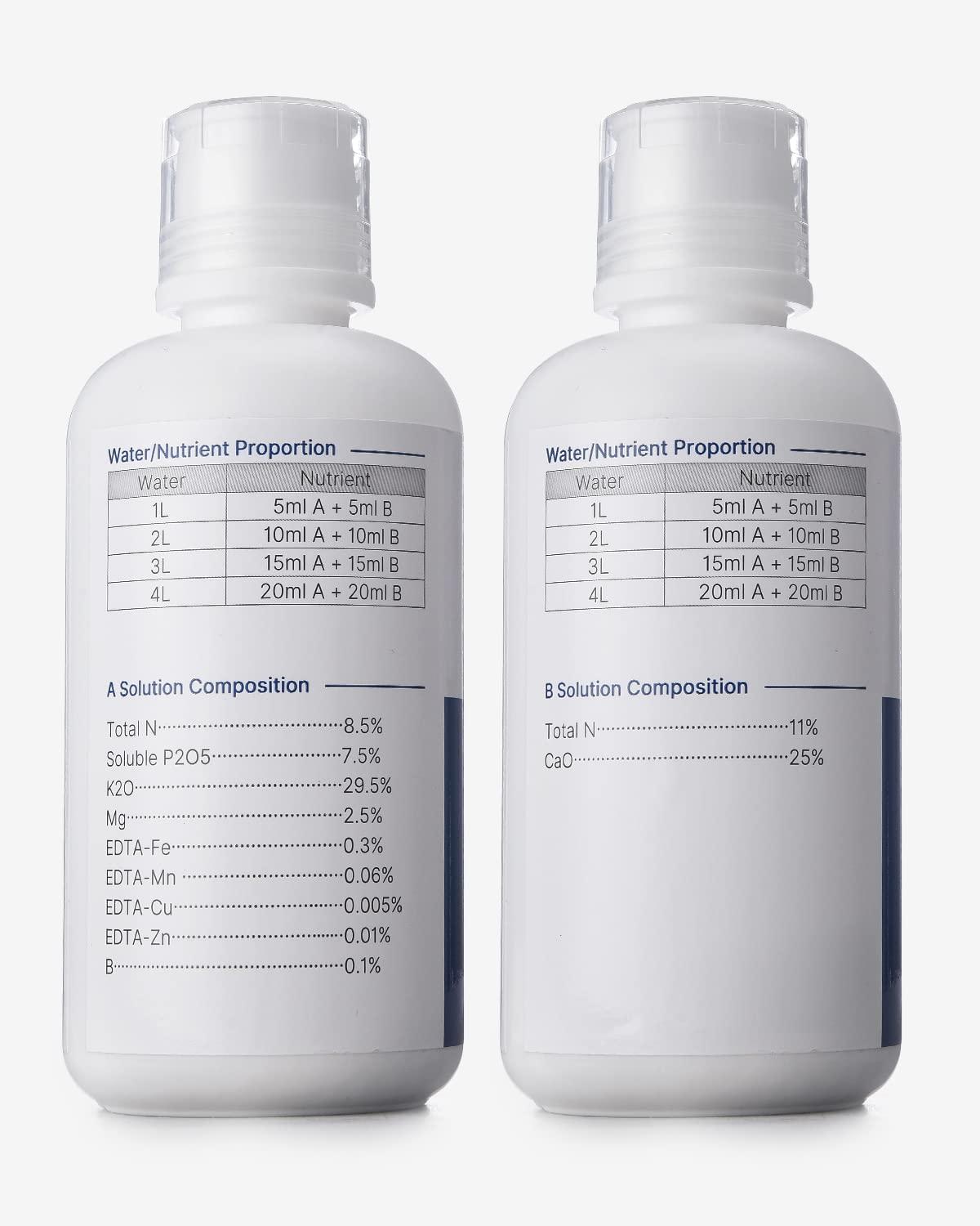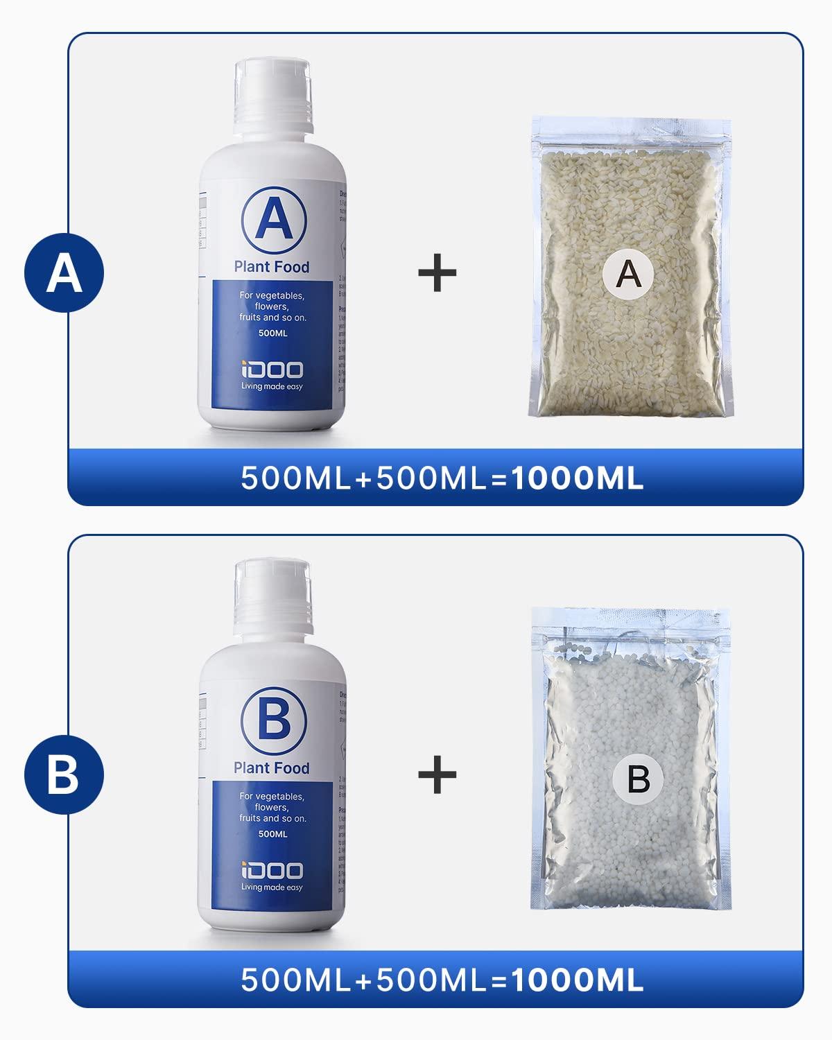 iDOO 70 oz (2000ml) Plant Food contains 500ml Bottle A(with nutrient particles), 500ml Bottle B(with nutrient particles), 500ml Refill-pack A, and 500ml Refill-pack B.