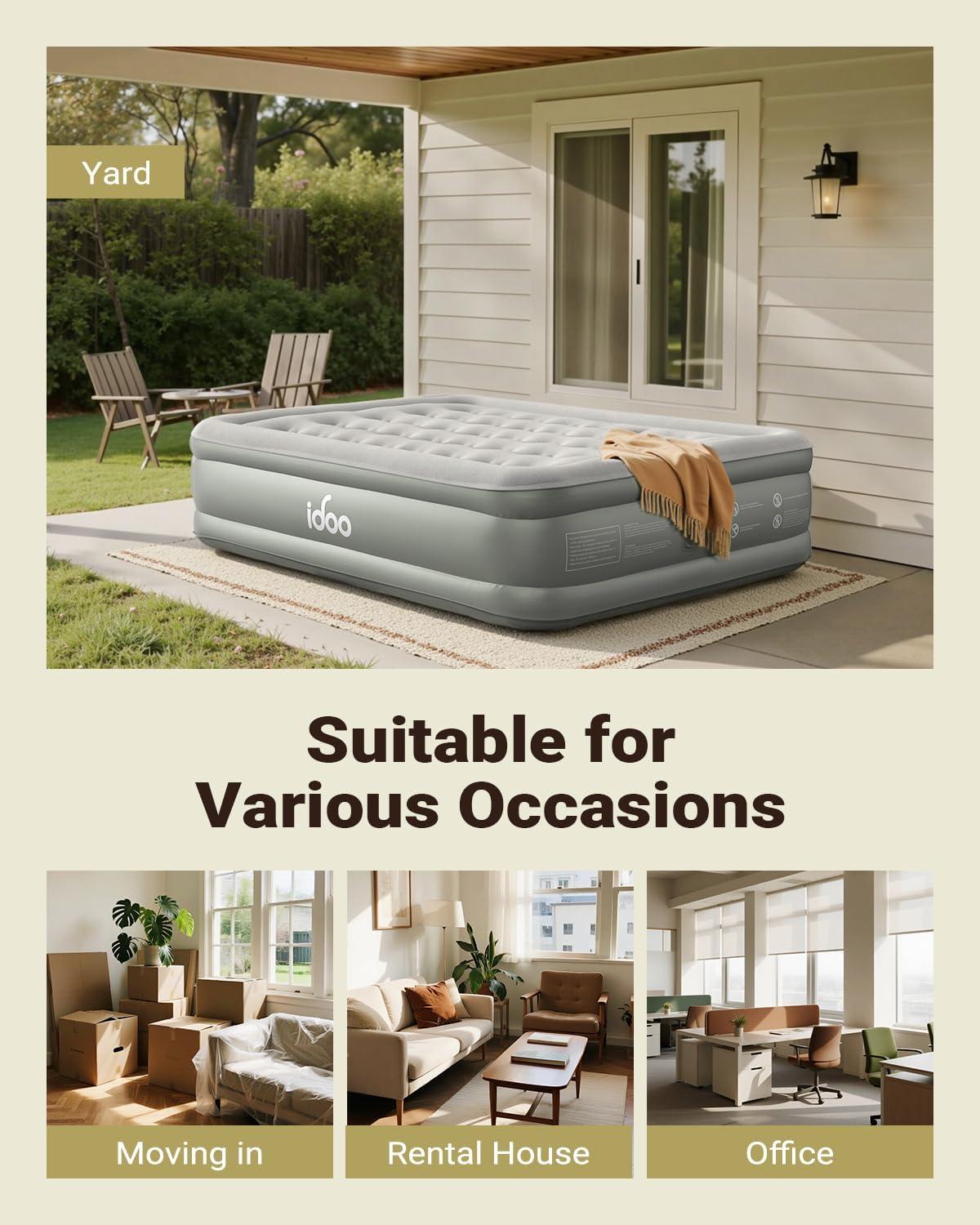 iDOO Air Mattress Wide Applications: Our air mattress queen size is deal for temporary use, home family gathering, Party, moving-in, renting house, yard and outdoor camping, last-minute overnight guest, guest air bed air mattress