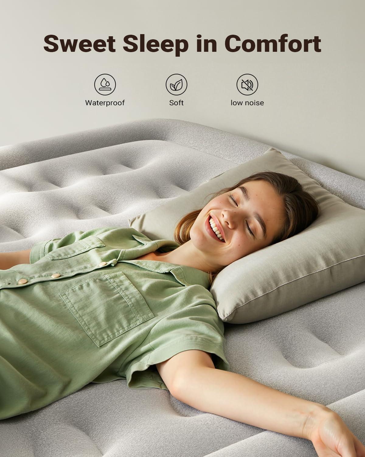 Unrivaled Luxury Comfort: The air mattress queen with built in pump is crafted with a soft and thick fabric flocked surface, skin-friendly and breathable, giving you a sleep experience like a real bed