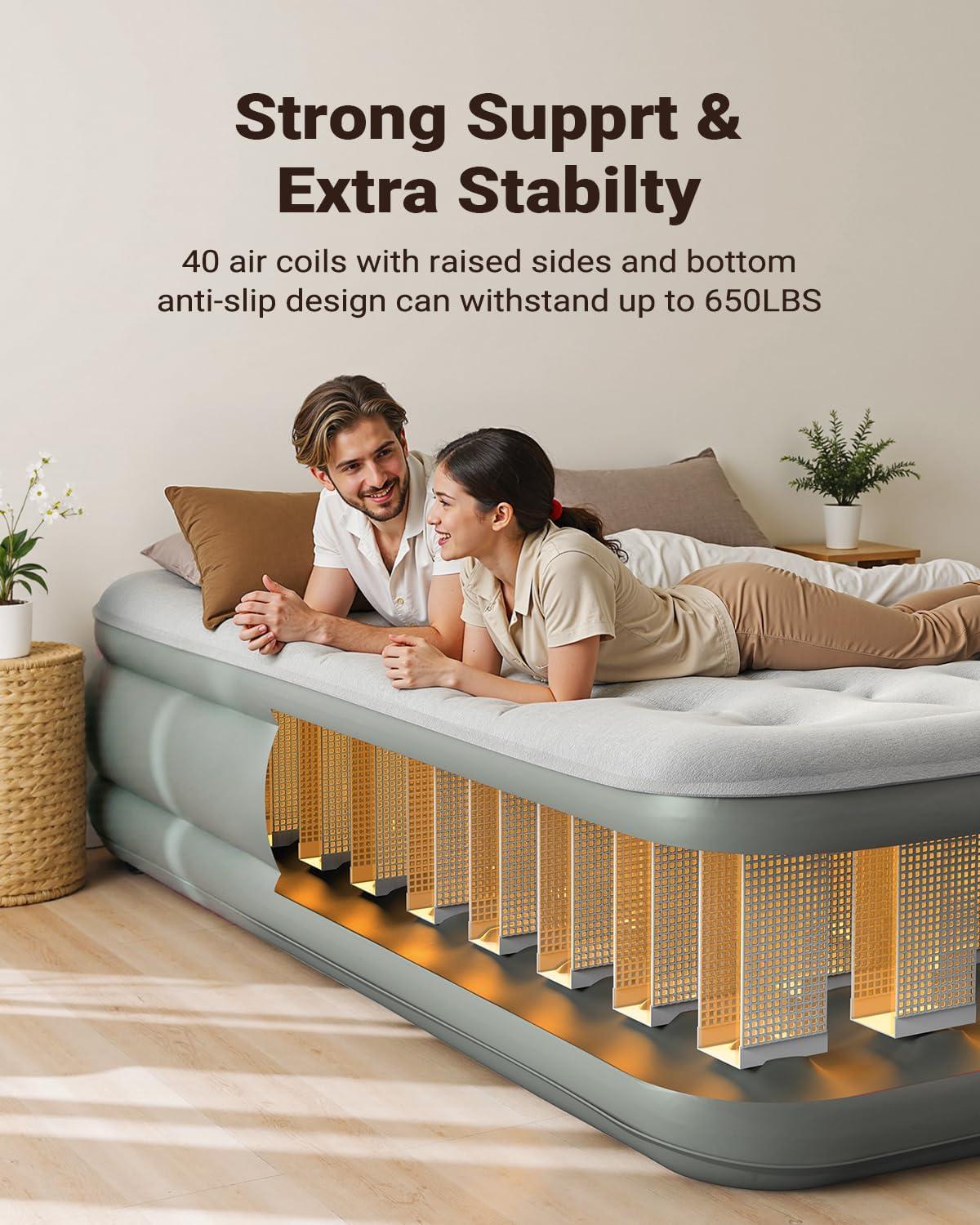 Stay Firm All Night: Our queen size air mattress features smart air coils that adapt to your body's natural contours, distributing weight evenly to prevent sinking, giving the queen inflatable mattress excellent support and stability